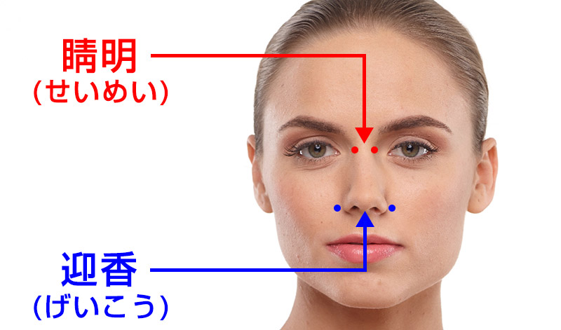 左右の人差し指で赤い点(画像参照)を鼻筋に向かって、はさむ感じでやさしく押し込むように刺激してください。