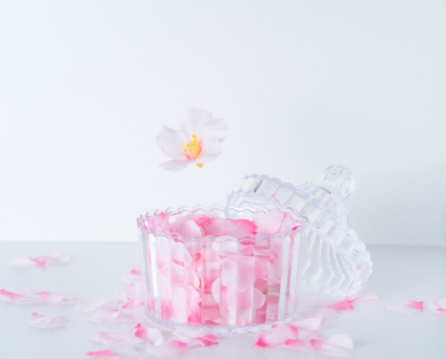 ガラスキャニスターにイミテーションフラワーを入れるだけで、ラグジュアリーな小物に大変身!